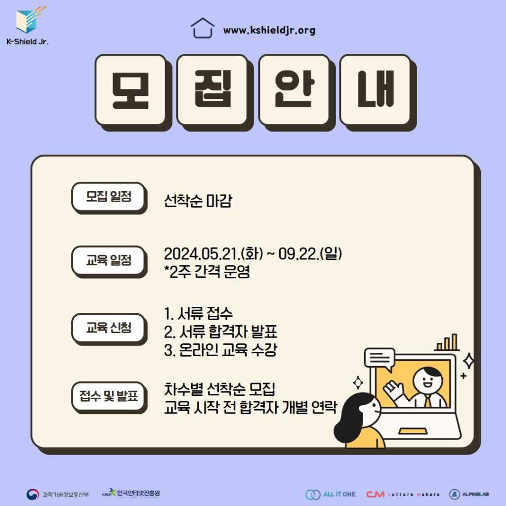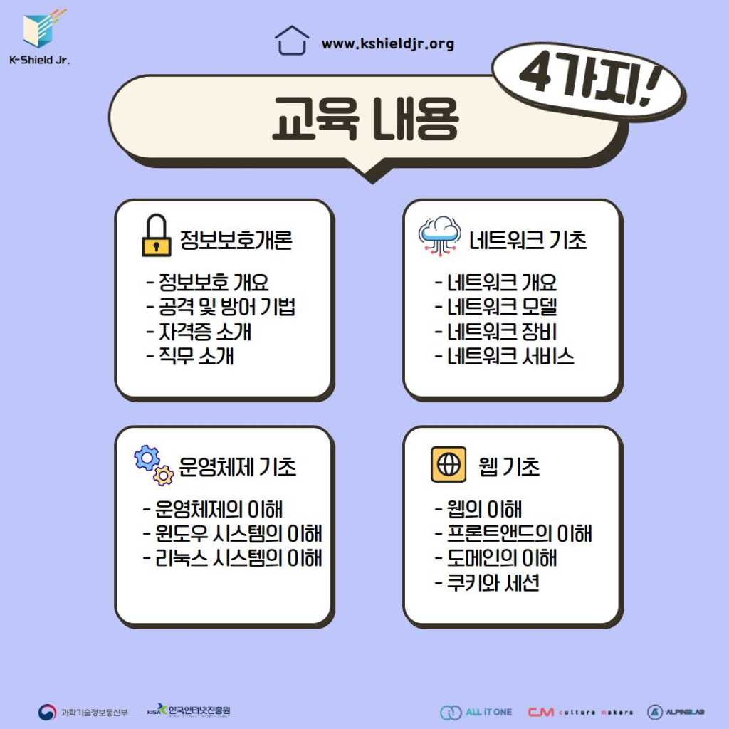- K-Shield Jr. 사이버보안 인력양성 과정은 바로 현장에 투입될 수 있도록 국내 보안 기업이 직접 요구하는지식과 기술을 집중적으로 다루며 각 과정에 맞는 교육 수료후 협력 업체와 연계해 취업을 지원하는한국인터넷진흥원이 주관하는 국내 최고의 교육과정입니다.