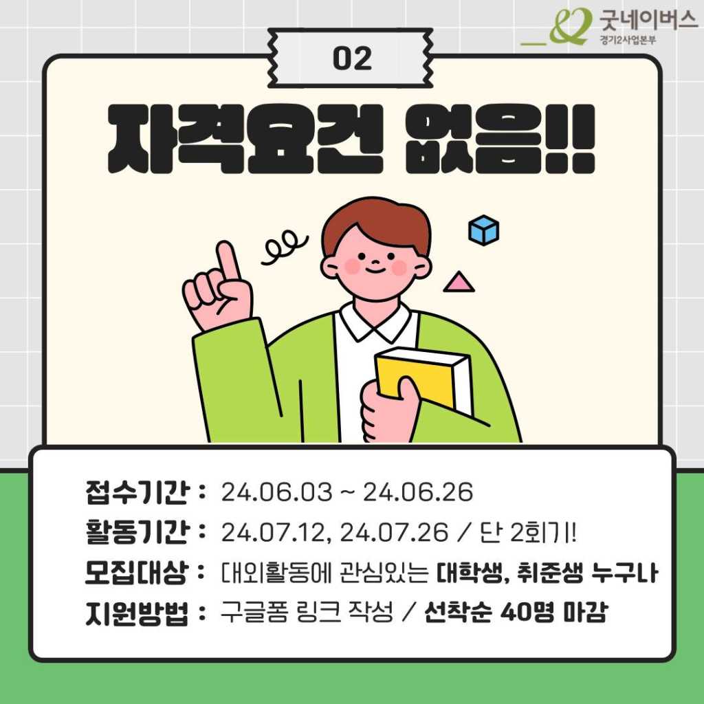 - NGO에 관심있는 대학생, (재학, 휴학, 졸업 예정자, 졸업생 가능), 취준생