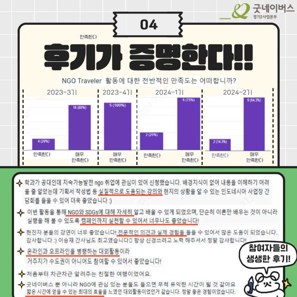 경기 고양2023년 참여자 프로그램 만족도 조사 중 "매우 만족한다" 응답 평균 85%를 자랑하는 ★ 모두가 기다려온 지상 최고의 단기 대외활동 ★ NGO Traveler 모집